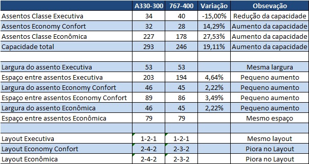 Obs.: Para os mais detalhistas, cabe destacar que as fileiras 39 a 42 (penúltima) do A330-300 possuem layout 2-3-2 e que a última fileira só possui as 3 cadeiras do meio.